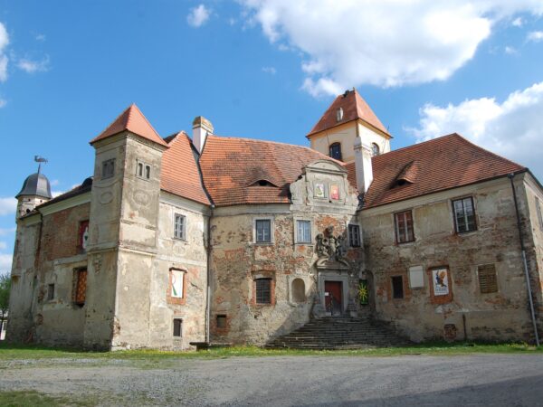Das Schloss Blatná steht in der gleichnamigen Stadt am Ufer des Flusses Lomnice. Zusammen mit dem Schloss Červená Lhota ist das Schloss Blatná eines der bekanntesten Wasserschlösser in Böhmen. Ursprünglich stand hier eine Festung, die in der 1. Hälfte des 13. Jahrhunderts gegründet wurde. An seiner Stelle wurde noch vor dem Jahr 1400 eine Wasserburg erbaut. Diese wurde in den Jahren 1523 – 1530 um einen Renaissancepalast erweitert und in den Jahren 1850 – 1856 regotisiert. Der älteste Teil der Burg ist eine romanische Kapelle, die um das Jahr 1220 entstand. Der alte Palast im nordwestlichen Burgteil und der Eingangsturm stammen aus dem 15. Jahrhundert. Das Schlossinterieur – insbesondere im Eingangsturm – wird durch wertvolle Wandgemälde aus der 2. Hälfte des 15. Jahrhunderts geschmückt. Der weit ausgelegte Schlosspark wurde Anfang des 19. Jahrhunderts aus einer ehemaligen Gehege errichtet und ist mit dem Schloss durch eine Holzbrücke verbunden. Zu den bedeutendsten Besitzern der Herrschaft gehörten die Herren aus Rožmitál, die Šternberker und die Hildprandts. Expositionen auf der Führungsstrecke: 1. Arbeitszimmer von Jan Evangelista Purkyně 2. Jagdsalon 3. Empiresalon 4. Familiengalerie 5. Privatsammlung aus Äthiopien In der Sommersaison wird die Führung noch um die “Grüne Stube” mit Wandgemälden aus dem Jahr 1480 in dem Schutzturm erweitert.