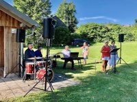 Bei der mährischen Band „JAZZ BASE“ war nichts von der 400 km langen Anreise zu spüren. Fast drei Stunden spielten die drei Musiker und die Sängerin beschwingt durch den Sommerabend. Bei den letzten Stücken gesellten sich ein paar Tanzbegeisterte auf die Wiesenbühne. Sie animierten die Band zu ein paar Zugaben, die mit dankbarem Publikumsapplaus honoriert wurden. Gleich neben der Bühne offerierte das Team vom CeBB Getränke und Steckerleis, das als Dessertschmankerl für viele das i-Tüpfelchen beim Picknick war.
