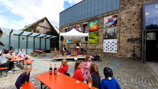 Die Duopoli-Band aus Neunburg v.W., die sich als kleinste Bigband der Welt bezeichnet, übernahm mit Swing die musikalische Begrüßung. Die Stücke passten gut als Auftakt und Überleitung zum Märchenerzähler Oliver Machander, der zusammen mit Sabrina das jüngere Publikum am Nachmittag in die bayerisch-tschechische Märchenwelt mitnahm. In seinem Koffer hatte er das Märchen „Nicht zornig werden“ aus der Feder des größten Oberpfälzer Märchenerzählers und 1810 in Amberg geborenen Franz-Xaver von Schönwerth und das tschechische Märchen „Wer ist dümmer“ dabei. Beim Ausflug in die Märchenwelt füllte sich zusehends das Areal, zur Kaffeezeit war die Schmierkuchentheke des Trägervereins eine gefragte Station.