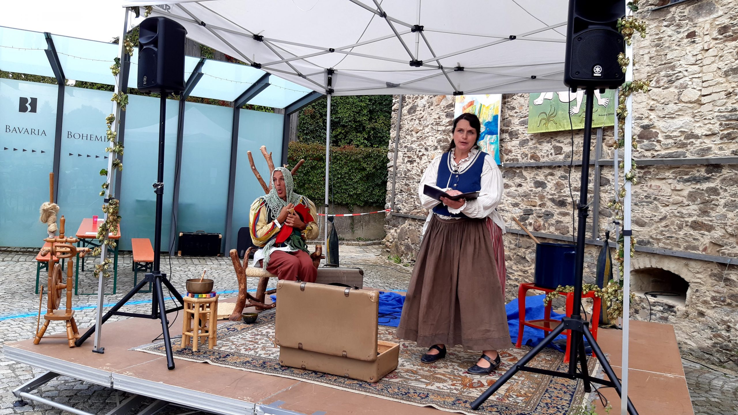 Die Duopoli-Band aus Neunburg v.W., die sich als kleinste Bigband der Welt bezeichnet, übernahm mit Swing die musikalische Begrüßung. Die Stücke passten gut als Auftakt und Überleitung zum Märchenerzähler Oliver Machander, der zusammen mit Sabrina das jüngere Publikum am Nachmittag in die bayerisch-tschechische Märchenwelt mitnahm. In seinem Koffer hatte er das Märchen „Nicht zornig werden“ aus der Feder des größten Oberpfälzer Märchenerzählers und 1810 in Amberg geborenen Franz-Xaver von Schönwerth und das tschechische Märchen „Wer ist dümmer“ dabei. Beim Ausflug in die Märchenwelt füllte sich zusehends das Areal, zur Kaffeezeit war die Schmierkuchentheke des Trägervereins eine gefragte Station.