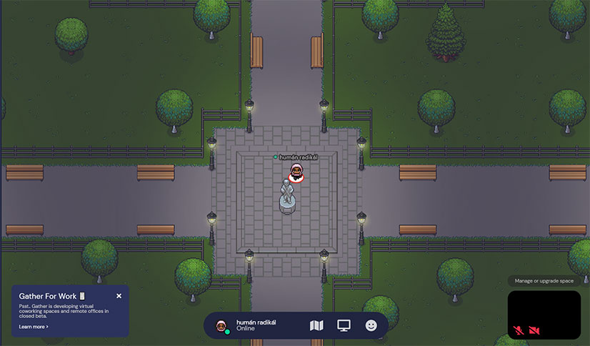 Die Vorstellung fand auf der Plattform gather.town statt, die in ihrer Gestaltung an ein Computerspiel erinnert. Beim Zuschalten stellten sich die Zuschauer jeweils einen eigenen Avatar zusammen, mit dem sich jede und jeder in der geschaffenen Welt bewegte. Hier kam es durch die audiovisuelle Übertragung zur direkten Interaktion mit den jungen Akteuren des Projekts, die das Publikum in den Rollen unterschiedlicher, sich im Prozess der Radikalisierung befindlicher Figuren mit ihren Geschichten begleiteten. Interaktivität und Wahlmöglichkeiten bereiteten den Zuschauern ein individuelles persönliches Erlebnis. Dessen Höhepunkt war es, als die Akteure schließlich ihre Rollen ablegten und gemeinsam mit dem Publikum auf dem “großen Sammelplatz” der Online-Welt und Schauplatz der Vorstellung an einer Soziometrie mit thematischen Fragen teilnahmen. Einige Zuschauer und Zuschauerinnen beteiligten sich auch an der sich anschließenden Diskussion.