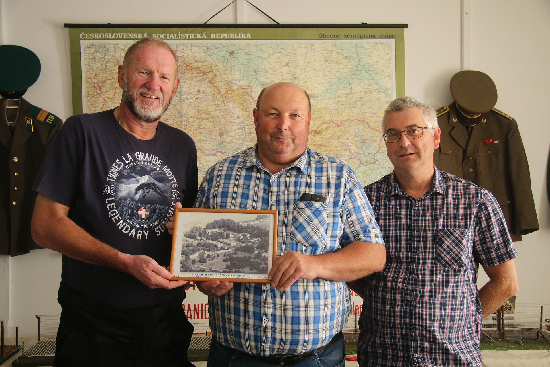 Mit mir ist Reinhold Balk gekommen, der als ehemaliger Sachbearbeiter Sicherheit beim Bundesgrenzschutz für die Grenze zuständig war und eine Mittlerposition zwischen Polizei, Zoll und US Army hatte. Er und seine ehemaligen Kollegen forschen intensiv zur Geschichte der Grenze, dokumentieren, sammeln, fügen Informationen aus deutschen und tschechischen Archiven zusammen. Das Museum Kóta kennt er seit der Eröffnung im Juli 2014 und ist von seiner Realitätsnähe und Detailgenauigkeit beeindruckt. Zur Eröffnung brachte er ein gerahmtes Foto mit, eine Luftaufnahme der Grenzwachkaserne, die 1988 aus einem Hubschrauber des BGS gemacht wurde. Reinhold Balk bestätigt, dass unter den etwa 900 Todesfällen, die die Grenztruppen in der Zeit des Eisernen Vorhangs zu verzeichnen hatten, nur etwa ein Dutzend auf sog. Feindkontakt zurückzuführen waren. Die Mehrheit der Todesfälle dagegen waren Unfälle, häufig auch Suizide. Auch Morde waren dabei. Der tragische Fall des Wehrdienstleistenden Ulrych, der bei Železná / Eisendorf von seinem Kameraden, der über die Grenze fliehen wollte, erschossen und vom Wachturm in die Tiefe gestürzt wurde, ist im Gang des Museums dokumentiert.