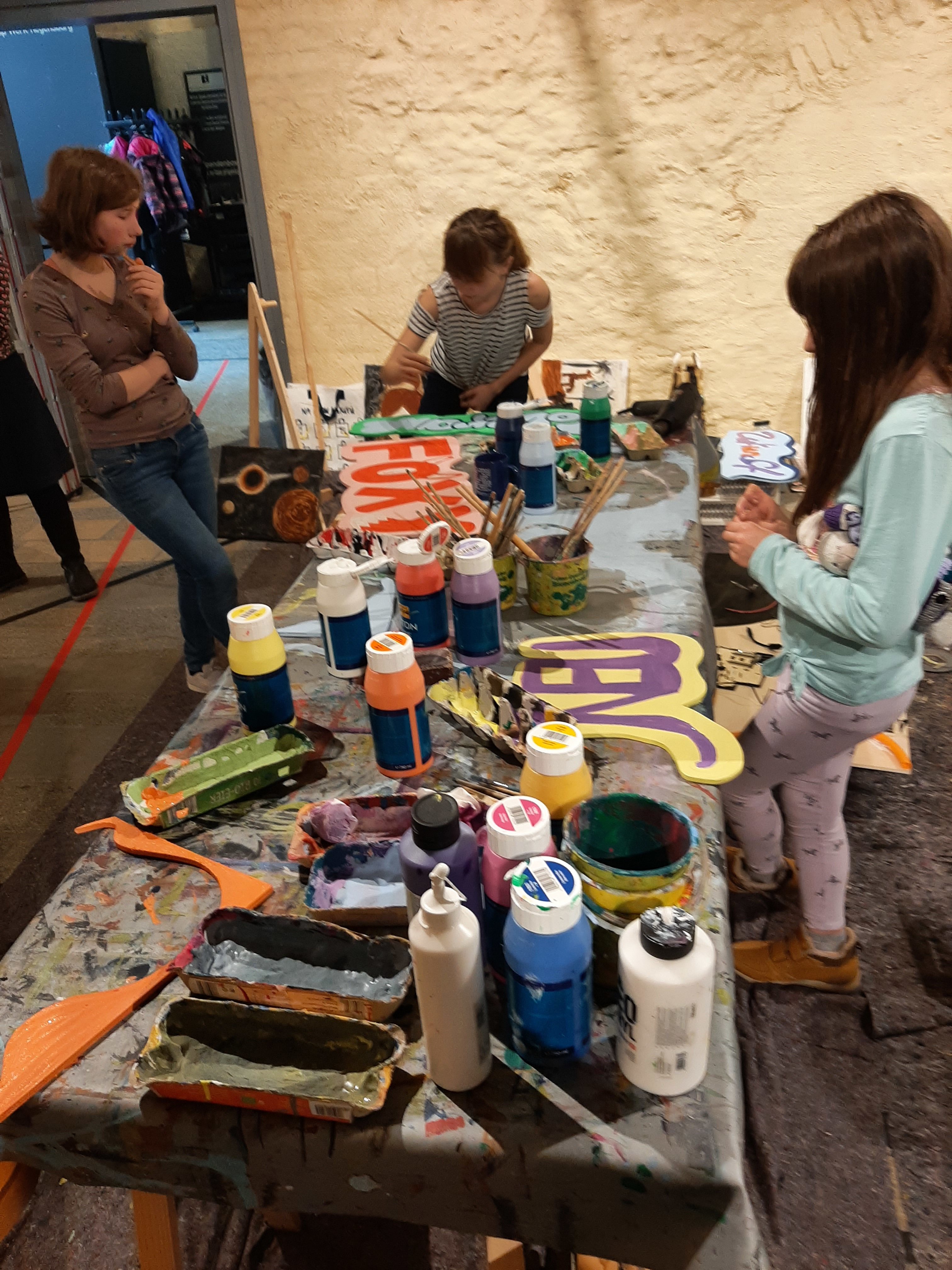 Da gab es Malerei, Papiergestaltung, Objektbau aus Computerschrott , ein historisches Malatelier, eine Druckstation, eine Schilderwerkstatt und alte Uhrwerke, die zum Zeichnen mit Tusche und Feder anregten. Dreh- und Angelpunkt der Workshoptage rund um die Zeitmaschine  aber war die gemeinsame Arbeit auf der Holzbaustelle . Eine achteckige Grundkonstruktion mit pyramidenförmigen Abschluss erweiterten die jugendlichen mit Öffnungen und  Einblicken zu einem nach innen spiralförmigen, begehbaren Raumobjekt. Dabei aktiv mit Werkzeugen arbeiten zu dürfen und eigenständig mit zubauen war für viele der Teilnehmenden  eine wertvolle Erfahrung der Beteiligung. „Das war das erste Mal, dass man mir einfach eine Bohrmaschine in die Hand gegeben hat und mich mitmachen ließ. In unserem Bildungssystem ist so etwas sonst gar nicht möglich“, erzählte Pepik aus Domazlice. Franzi aus Cham fand die  Teamarbeit toll und dass es viel eigenen Entscheidungsfreiraum gab. Charlotte, mit acht Jahren die jüngste der Gruppe, war stolz darauf, einige Worte tschechisch gelernt und zum ersten Mal ohne Eltern in einem Hotel übernachtet zu haben.  Alle waren begeistert,  dass es trotz der Sprachschwierigkeiten gelang, so gut miteinander zu arbeiten. Daran hatte auch die Sprachanimation am Vorabend großen Anteil, Mit spannenden und erlebnisreichen Spielen lernten die Teilnehmende sich bereits gut kennen und hatten gemeinsam schon am ersten Abend Spaß. So verging die Bau- und Gestaltungszeit letzt endlich wie im Flug und pünktlich um 13:27 h wurde die Zeitmaschine am Sonntag für das Publikum eröffnet.