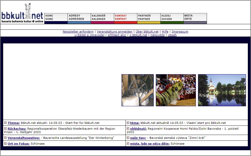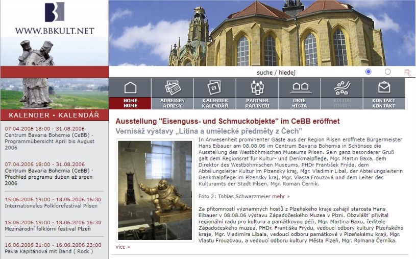 Am 14. Mai 2003 startete das Onlineportal, das sich zum Ziel gesetzt hat, Tschechen und Bayern auf kultureller Ebene zu verbinden. Denn in der Kultur ist die Sprachbarriere zweitranging – Musik, Kunst, Kulinarik – all das ist auch ohne die Kenntnis der Nachbarsprache möglich. Seitdem hat bbkult.net über 33.000 Veranstaltungen in den sechs Nachbarregionen (Oberfranken, Karlsbader Bezirk, Oberpfalz, Pilsner Bezirk, Niederbayern und Südböhmischer Bezirk) veröffentlicht. Über 6.500 KulturAdressen mit Informationen zu Kultureinrichtungen, Kunsthandwerk, Künstlern, Musik, Sehenswürdigkeiten und Sporteinrichtungen laden ein, die Nachbarregionen zu entdecken. Darüber hinaus bietet bbkult.net auch aktuelle Informationen rund um die deutsch-tschechischen Beziehungen. Schauen Sie rein…
