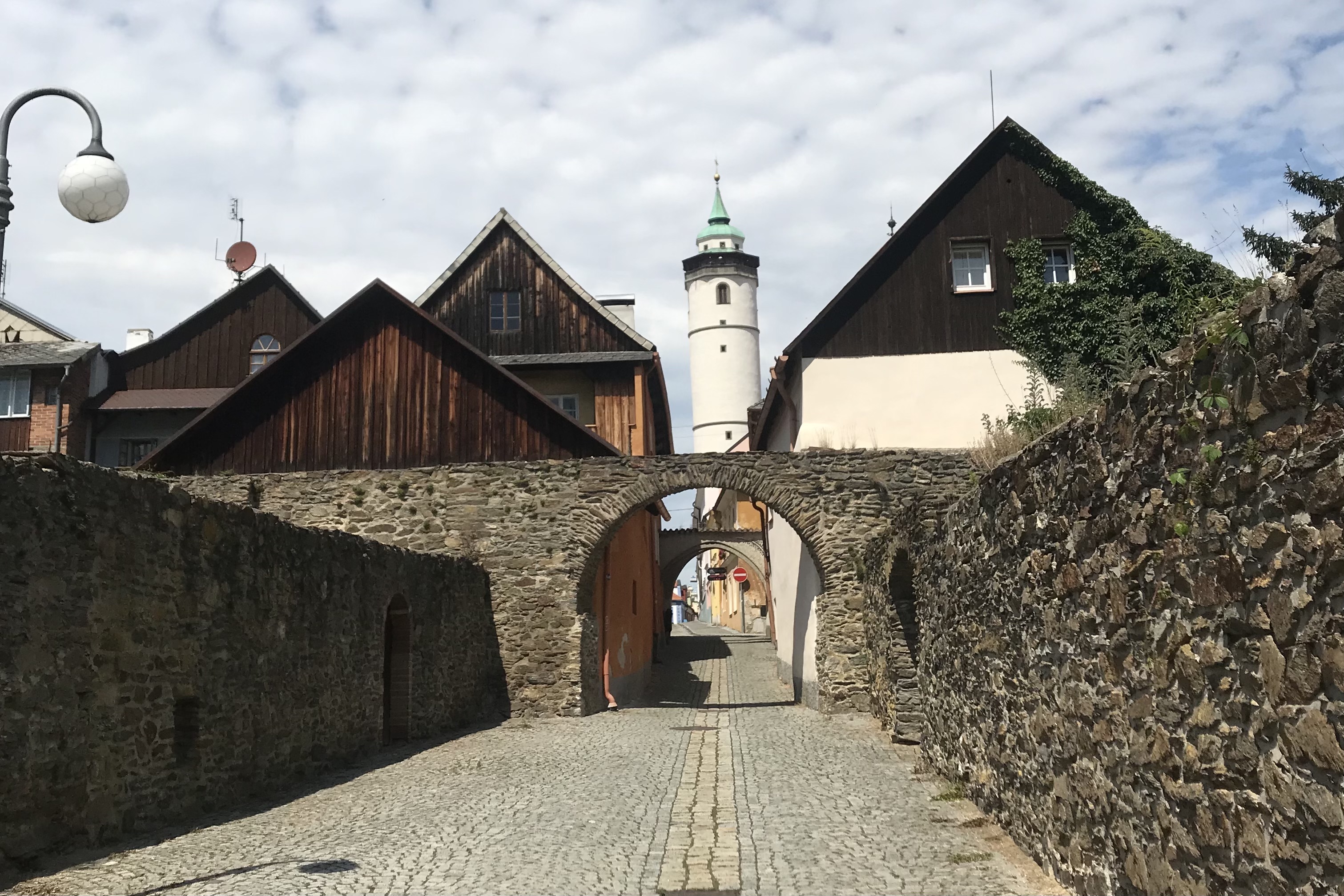 Gut ausgeschlafen sind wir mit die ersten auf den Beinen. Heute wollen wir Domažlice erkunden. Wir gehen vor zur Bushaltestelle, an die Hauptstraße. Der nächste Bus fährt erst in einer Stunde. Wir entscheiden uns zu trampen, haben Glück. Nach knapp 10 Minuten hält ein freundlicher, älterer Herr und bringt uns direkt in das Zentrum der Stadt. Wir bedanken uns. Erstes Ziel, die Touri – INFO. Eine freundliche, engagierte Frau berät uns. Domažlice ist eine sehenswerte Stadt. Das Stadtbild wird durch den langgestreckten Marktplatz mit seinen Laubenhäusern, durch das Untere Tor und den leicht schiefen Turm der Stadtkirche Maria Geburt geprägt. In einen der südländisch anmutenden Laubenhäusern finden wir ein Sportgeschäft. Nach der “Čerchov – Erfahrung” brauche auch ich dringend ein Paar gute Wanderstöcke. Wir werden fündig! Nächste Station die Chodenburg. Darin befindet sich das Chodenlandmuseum. Besonders die Chodentrachten haben es uns angetan. Bunt und wunderschön! Wer mehr über die Geschichte der Stadt und die Tradition der Choden erfahren möchte, auf nach Domažlice, ab ins Museum. Empfehlenswert! Unser Wissensdurst ist gelöscht, nun möchten wir unsere Bäuche sättigen, natürlich mit böhmischer Kost. In einem Restaurace am Marktplatz werden wir aufs Beste bewirtet. Im Anschluss schlendern wir durch weitere Teile der Stadt, entdecken verwunschene Winkel, besteigen den Kirchturm. Stolze 56 Meter, 194 Stufen, um 59 cm leicht geneigt. Wir genießen bei sonnigen Sommerwetter beste Sicht. Herrlich! Der Auf- und Abstieg hat es in sich. Steil. Eng. Achtung Kopf! Nach einen Blick in die wunderschöne barocke Kirche, genießen wir Kaffee und Kuchen. Köstlich! Um 17:15 geht es mit dem Bus zurück nach Babylon. An unserem Platz gibt es Abendbrot mit frisch gezapften Bier vom Kemp – Bistro.