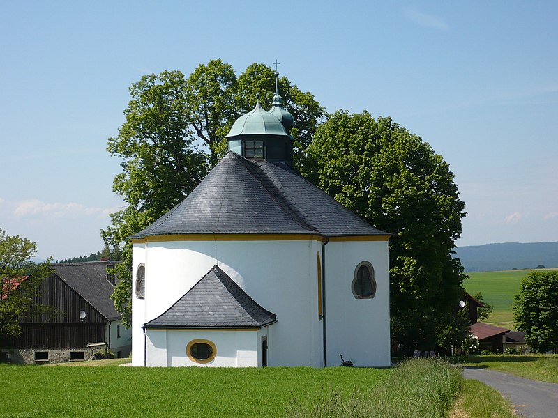 Boží dům nechal postavit v roce 1733 Philipp Muttone podle vzoru kaple Nejsvětější trojice u Waldsassenu. Kostel s křížením a nízkou kupolí má půdorys krátkého tvaru, na který jsou nasazeny ploché půloblouky, takže se podobají srdci. Rozhraní podélné a příčné osy tvoří střed kostela. Tam se střecha prohýbá nahoru. Na střeše je umístěná lucerna.
