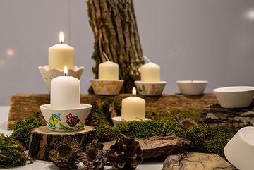 Adventní věnec trochu jinak! Bez pichlavých jehel, ale z přírodního dřeva s držáky na svíčky z ryzího bílého zlata! Malí i velcí společně pracují v očekávání blížících se Vánoc. Aby mohl adventní věnec zahalit vlastní čtyři stěny do předvánoční adventní atmosféry, budou pro něj namalovány čtyři porcelánové držáky. Fantazii se meze nekladou. Nakonec se připevní držáky a nasadí svíčky. K dispozici je výběr svíček.