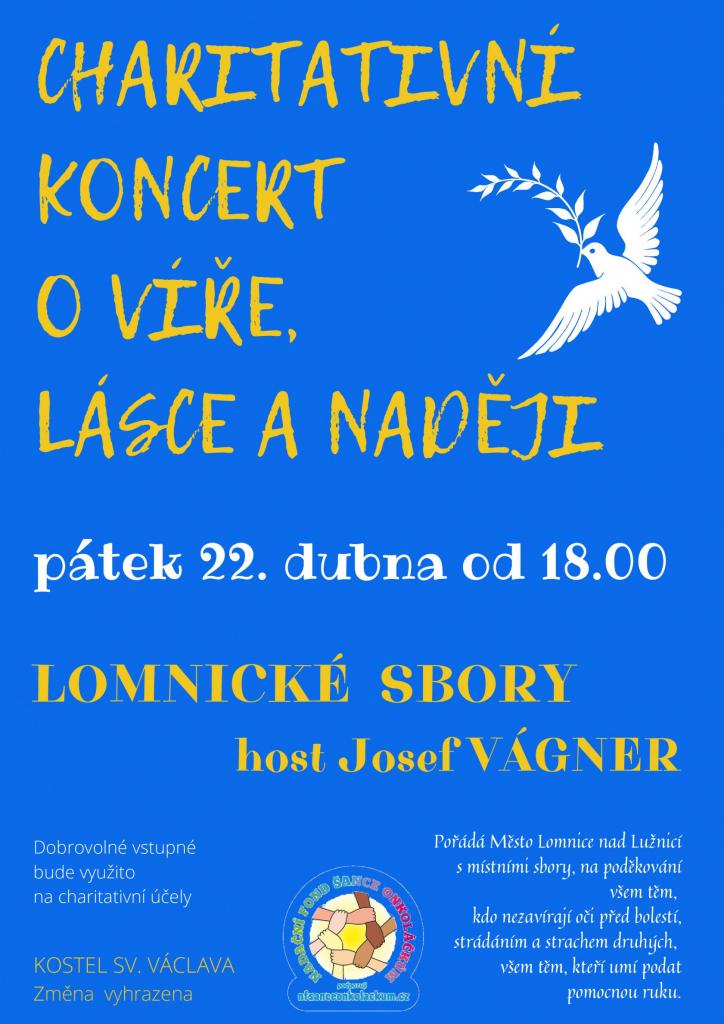 Charitativní koncert o víře, lásce a naději připravilo Město Lomnice n. L. spolu s místními sbory. V kostele sv. Václava se představí smíšený sbor Viva Musica, kostelní sbor KOS, folklorní soubory Javor a Javoráček. Koncert zahájí Josef Vágner a dobrovolné vstupné bude poukázáno nadaci Šance onkoláčkům.