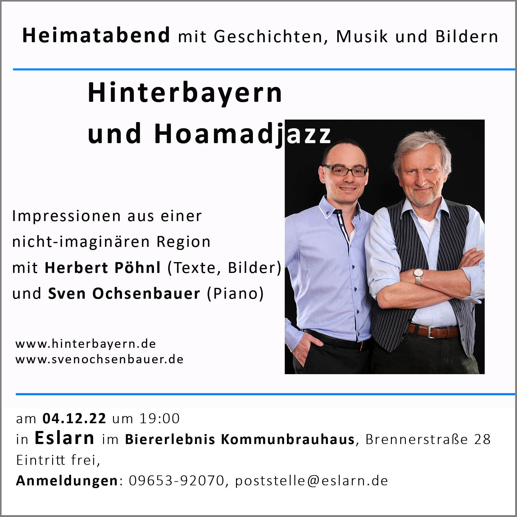 Oba aktéři spolu pracují od roku 2011, nejprve na projektu “Der halbwilde Wald” (Polodivoký les), poté vyvíjeli různé formáty, až dali dohromady projekt “Hinterbayern a HoamadJazz” (Zadní Bavorsko a domácí jazz), které se od té doby úspěšně prezentuje. Výsledek jsou šest knih Herberta Pöhnla a devět CD Svena Ochsenbauera.