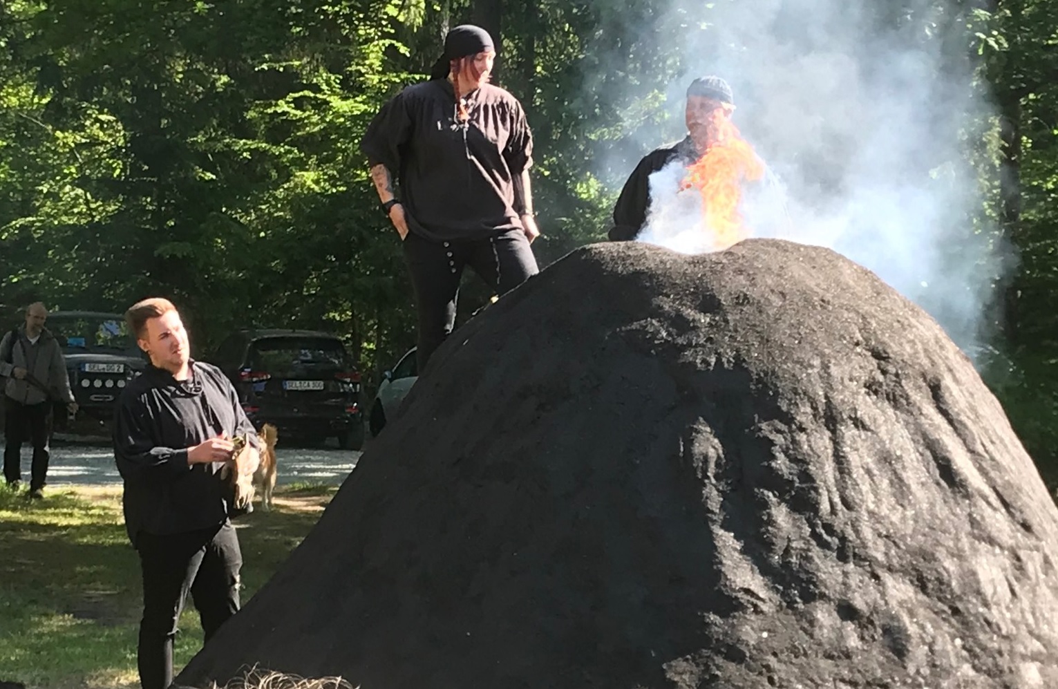 Po týdnu kontrolovaného ohně v milíři se vyndává hotové uhlí – a to je důvod k oslavě.