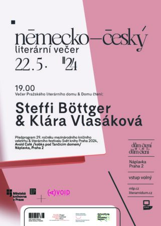 Tradiční česko-německé čtení, které se jako každoročně uskuteční v předvečer zahájení knižního festivalu a veletrhu Svět knihy. Letošními hosty budou naše aktuální stipendistka Steffi Böttger a spisovatelka Klára Vlasáková.