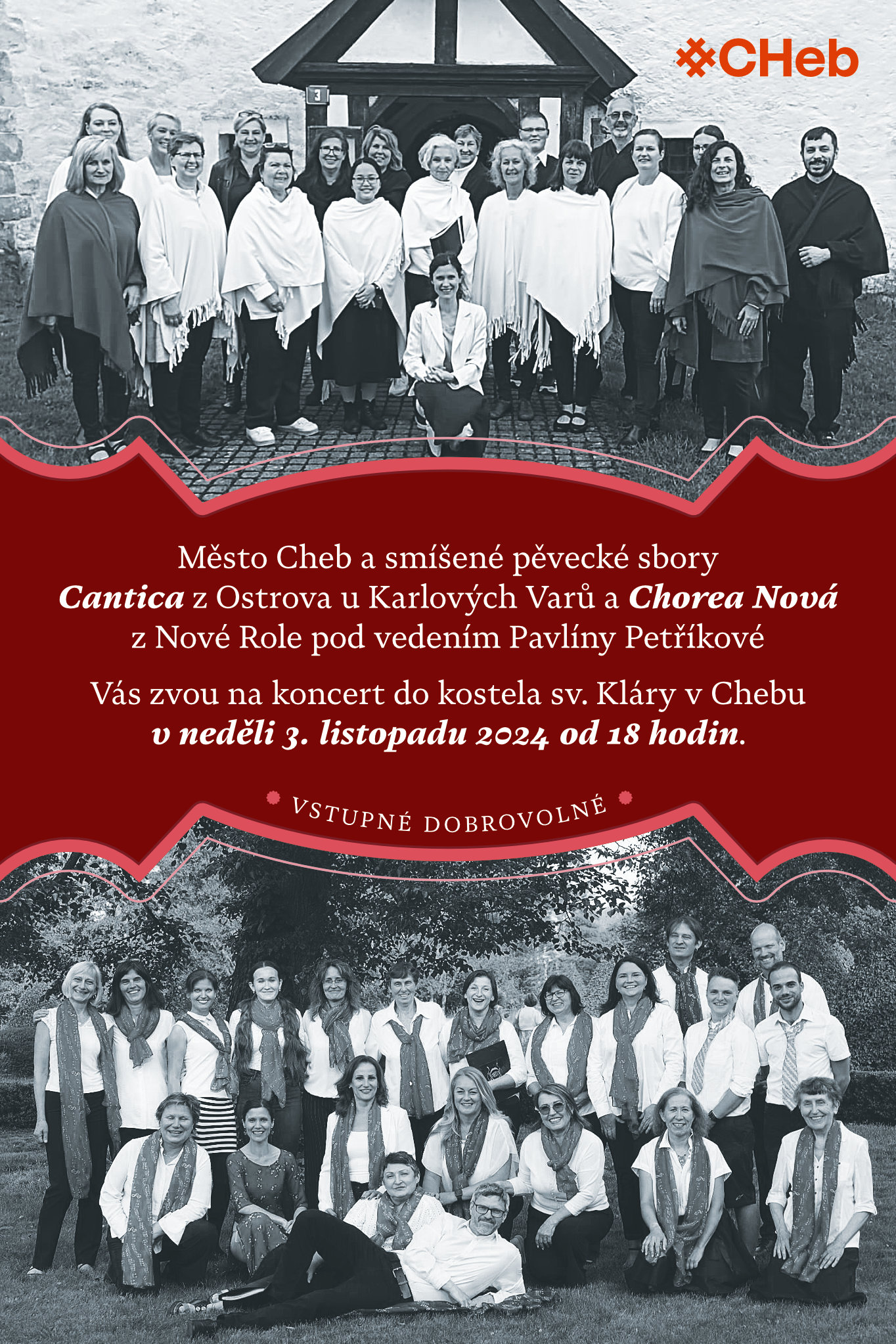 Město Cheb a smíšené pěvecké sbory Cantica z Ostrova u Karlových Varů a Chorea Nová z Nové Role pod vedením Pavlíny Petříkové Vás zvou na koncert do kostela sv. Kláry v Chebu.