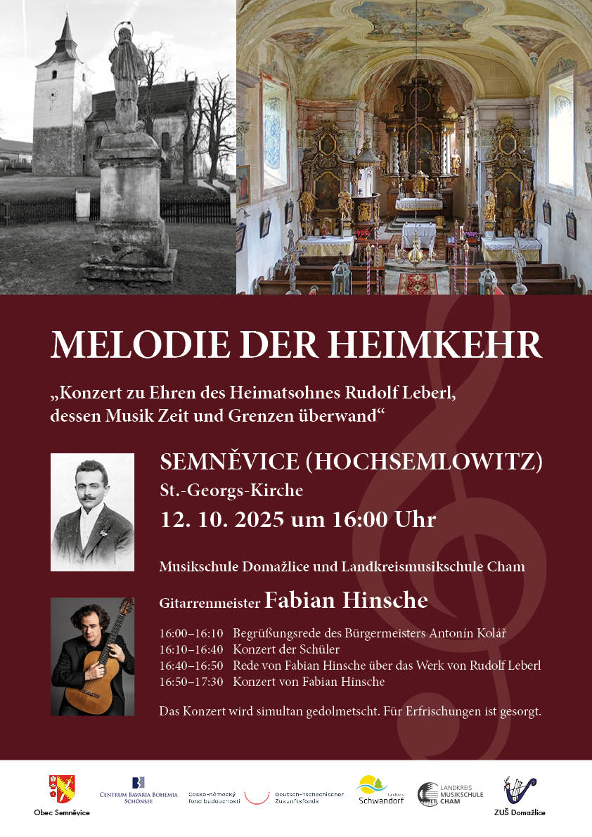 Koncert Melodie návratu je výrazem této paměti. Díky koncertnímu mistrovi Fabianu Hinschemu a nastudování žáků uměleckých škol v Domažlicích a Chamu se tóny Rudolfa Leberla znovu rozezní v jeho rodném kraji. V jejich ozvěně slyšíme, že zapomnění nikdy není úplné – že melodie mohou přemostit vzdálenosti let i osudové zvraty a znovu otevřít cestu k domovu svého skladatele.