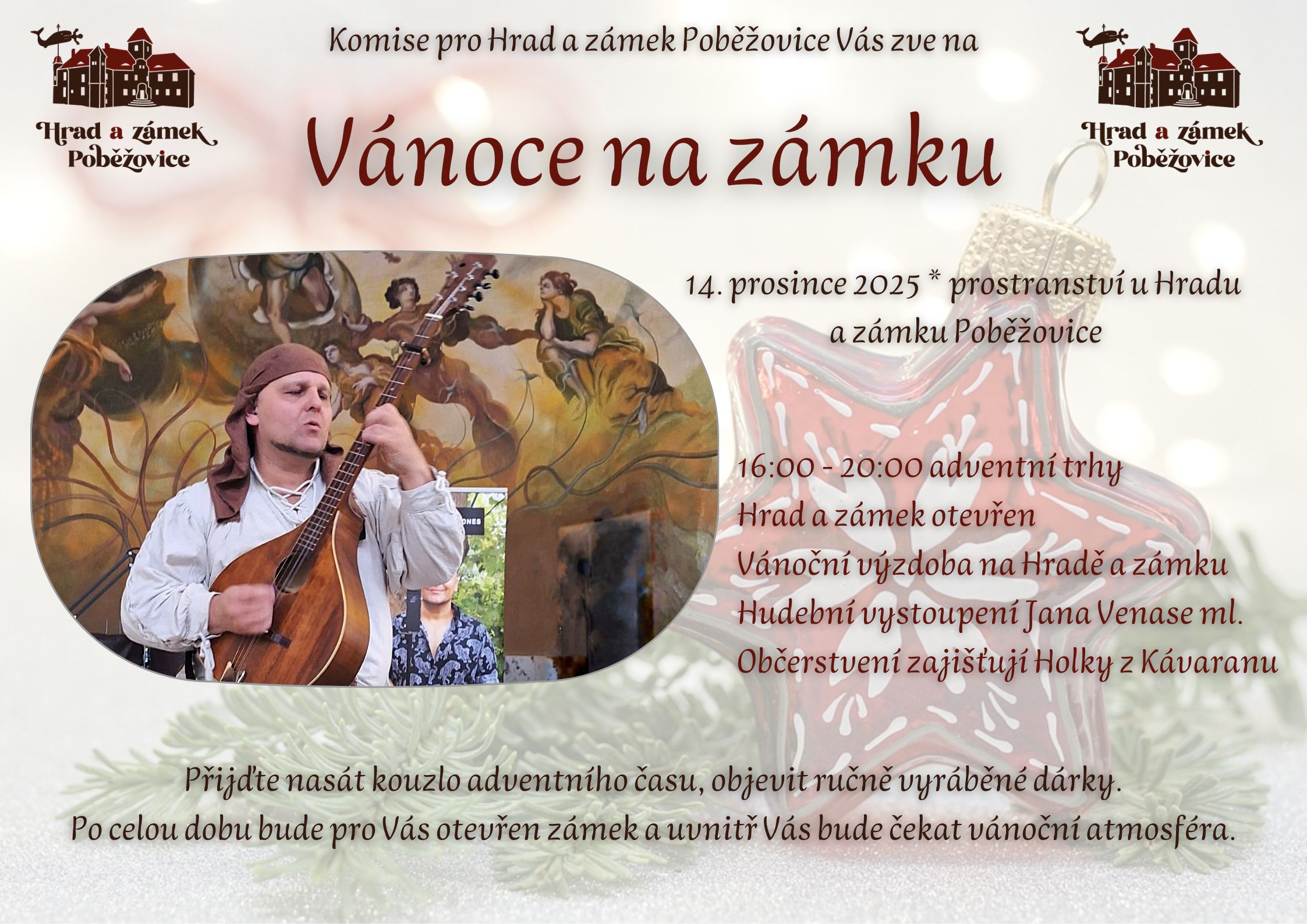Komise pro Hrad a zámek Poběžovice zve na akci s názvem Vánoce na zámku, která se uskuteční v prostranství u Hradu a zámku Poběžovice, budou připraveny adventní trhy, pro veřejnost bude zámek po celou dobu přístupný a akce hudebně doprovázena Janem Venasem ml.