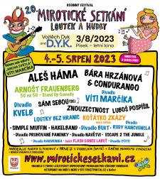 Fanoušci festivalu se letos mohou těšit na třídenní kulturní hostinu, kterou zahájí fenomenální Vojtěch Dyk se svojí novou kapelou D.Y.K.! Tímto jedinečným koncertem odstartujeme „SETKÁNÍ“, již ve čtvrtek 3. srpna 2023 ve 20:00 hod., a to výjimečně v Písku v prázdninové atmosféře letního kina. Jihočeské Mirotice si následně užijí rozkrojení slavnostního dortu a pestrý program.