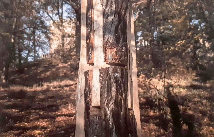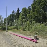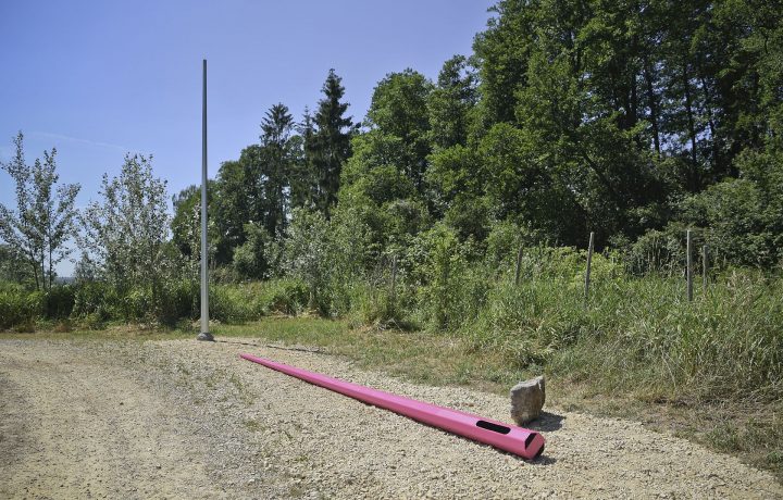 „Instalaci tvoří dva prefabrikované ocelové stožáry, z nichž jeden zaujímá sobě vlastní vztyčenou pozici a druhý leží padlý opodál. Prvotním impulsem k vytvoření této kompozice byla autorčina vzpomínka na český les a volně ležící smrkové klády natřené sytě růžovým insekticidním roztokem. V přímém kontrastu se zde nacházel stále živý, zelený lesní porost a již mrtvá torza stromů napadaná kůrovcem.“