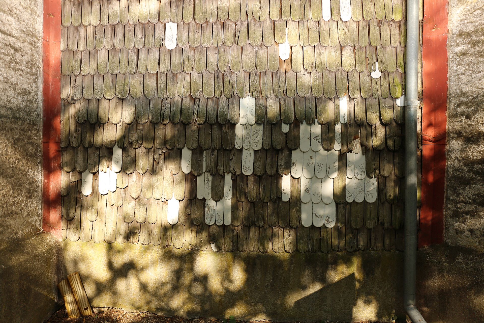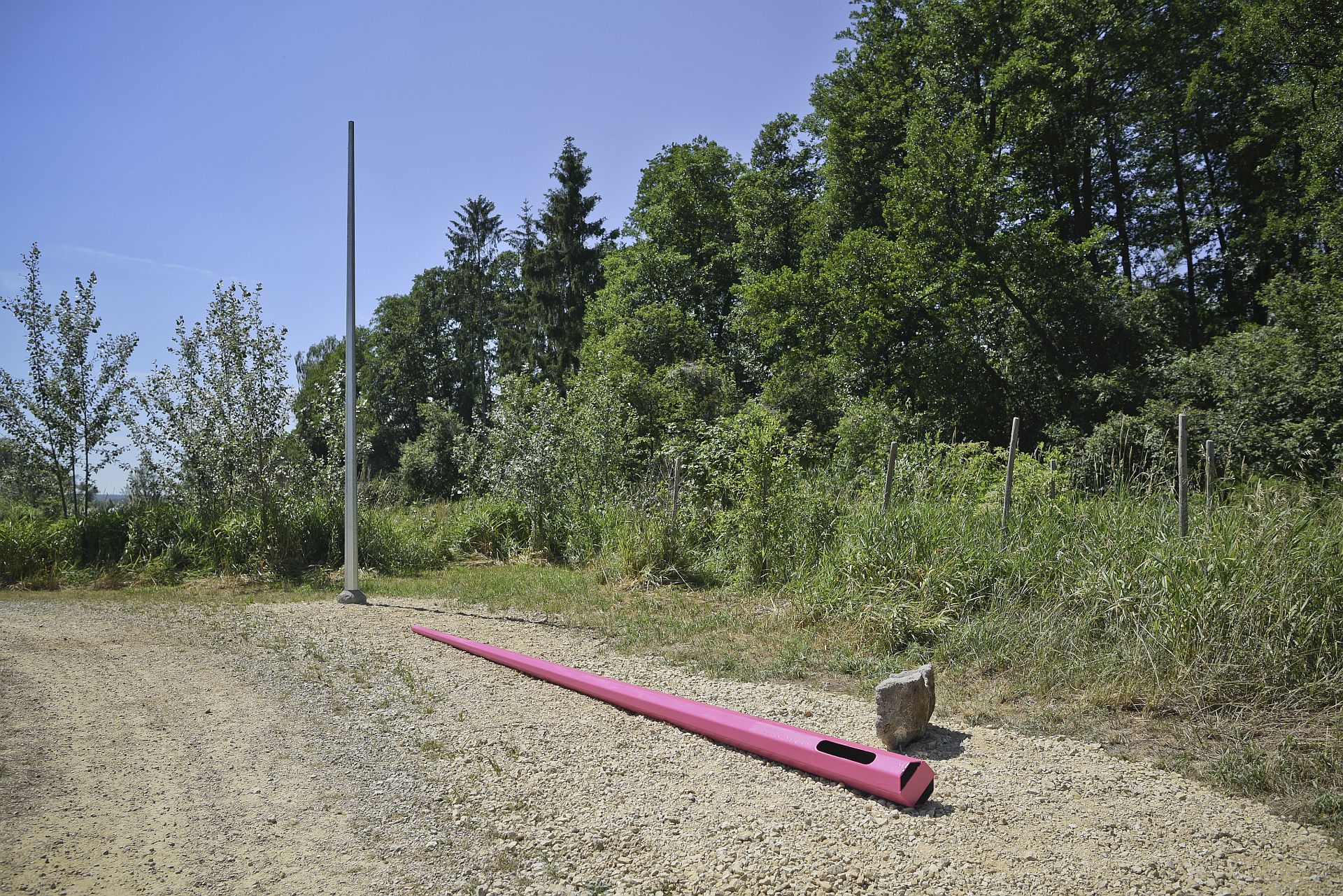 „Instalaci tvoří dva prefabrikované ocelové stožáry, z nichž jeden zaujímá sobě vlastní vztyčenou pozici a druhý leží padlý opodál. Prvotním impulsem k vytvoření této kompozice byla autorčina vzpomínka na český les a volně ležící smrkové klády natřené sytě růžovým insekticidním roztokem. V přímém kontrastu se zde nacházel stále živý, zelený lesní porost a již mrtvá torza stromů napadaná kůrovcem.“