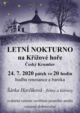 Sommerliches Notturnos Renaissance- und Barockmusik, vorgetragen von der Künstlerin Šárka Havlíková.VeranstaltungsortU Sáňkařské dráhy 462, Horní Brána, 381 01 Český KrumlovSüdböhmischer Bezirk, TschechienTermin 24.07.2020 20:00 - 21:30 PreisefreiwilligVeranstalter Kirche St. Veit in Český Krumlov (Krumau)Karte U Sáňkařské dráhy 462, Horní Brána, 381 01 Český Krumlov, Tschechien » Routenplanung öffnen
