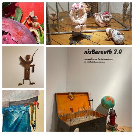 In drei Bereichen – Werken von Meike Goldfuss und Katrin Schinner, sowie von beiden als Duo nixBereuth 2.0, zeigt die Ausstellung Objekte der Malerei, Assemblagen, skulpturale Arbeiten und Installationen.