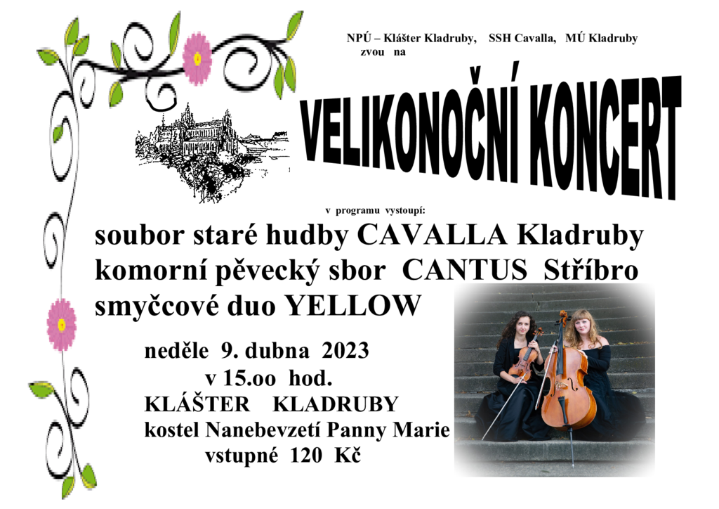 Auf dem Programm stehen das Ensemble für Alte Musik Cavalla, der Kammerchor Cantus und als Gast das Streicherduo Yellow in der Besetzung Pavla Mazancová Violine, Michaela Krejčová Vitáková Cello. Man kann sich auf klassische Melodien und Melodien aus Filmen freuen.