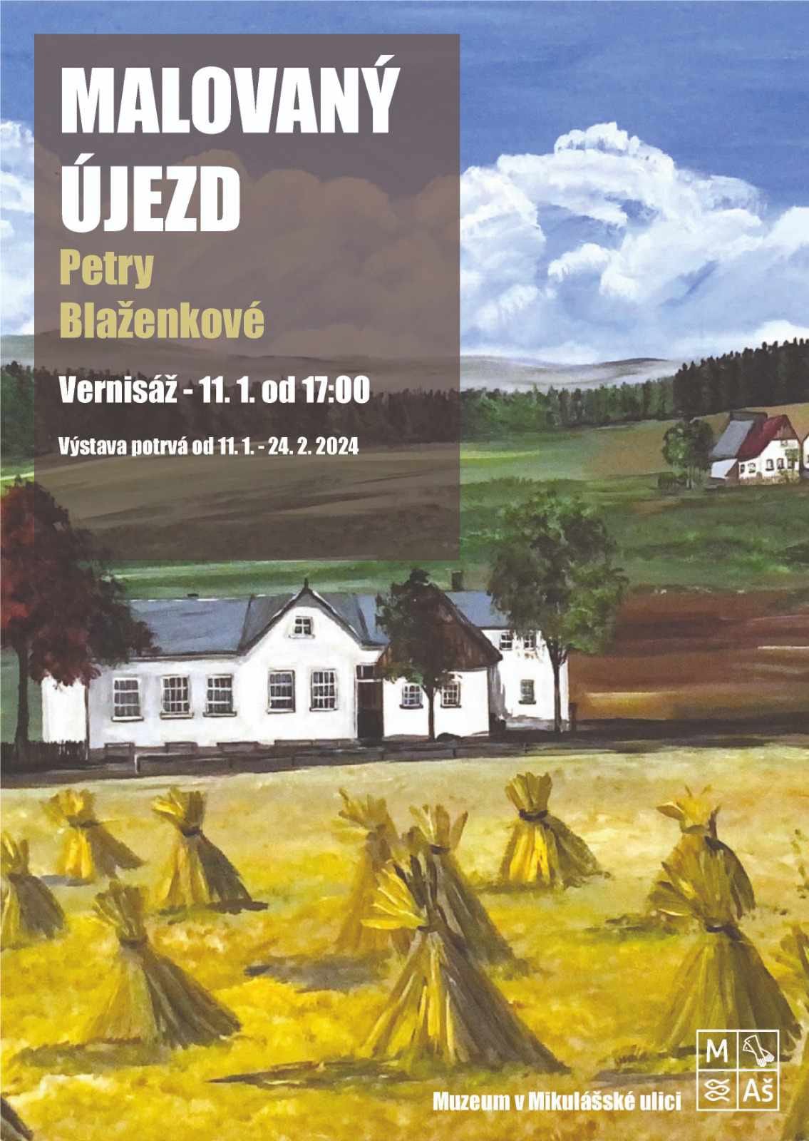 Ausstellung Gemaltes Mähring der Ascher Malerin Petra Blaženková ein. Die Ausstellung präsentiert 46 Häuser des ausgestorbenen Dorfes Újezd u Krásné (Mähring bei Asch).