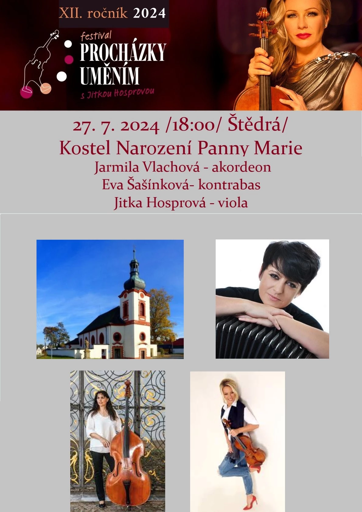 Zwei hervorragende Interpreten, die Kontrabassistin Eva Šašínková und die Akkordeonistin Jarmila Vlachová, bieten in ihrem Programm eine äußerst interessante Kombination von Instrumenten. Das Programm basiert auf der Barockzeit und wird in seinem zweiten Teil den klassischen Kompositionen für Kontrabass, die damals sehr beliebt waren, Raum geben und Kompositionen von Kontrabassisten der Zeit G. Bottesini oder Dietters von Dittersdorf. An einem neuen Festivalort auf dem Territorium der Herren von Kokořov werden die Interpreten in der Barockkirche Mariä Geburt auftreten, das Konzert ist Teil der Reihe „Auf den Spuren der Herren von Kokořov“.