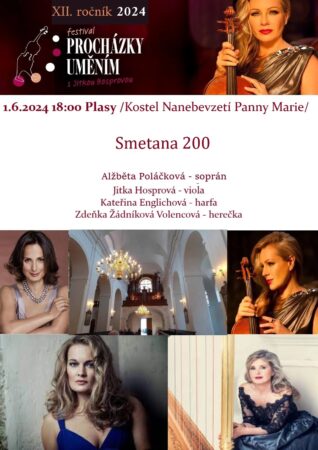 Bedřich Smetana hatte nicht nur in Pilsen, sondern auch in der Umgebung starke Bindungen. Pauline Metternich, die in Pilsen lebte, war nicht nur die Ehefrau von Richard Metternich, dem Sohn des berühmten österreichischen Bundeskanzlers, sondern vor allem eine der einflussreichsten Persönlichkeiten des kulturellen Lebens der Habsburgermonarchie zu jener Zeit. Wenig bekannt ist, dass sie eine große Bewunderin von Smetana war und sogar versuchte, seine Oper Die verkaufte Braut in Paris aufführen zu lassen. Im Saal der Schlossprälatur in Plasy wird Smetanas Musik – der Zyklus „Abendlieder“ – von der Solistin des Nationaltheaters, der Sopranistin Alžběta Poláčková, und der Harfenistin Kateřina Englichová aufgeführt, die auch Trnečeks Fantasie über Smetanas Moldau vertonen wird. Ergänzt wird das Programm durch französische Zeitgenossen von B. Smetana sowie den Liederzyklus „Zigeunerlieder“ von A. Dvořák. Das Konzert ist Teil des Festival-Zyklus „Auf dem Gut des Kanzlers Metternich“.