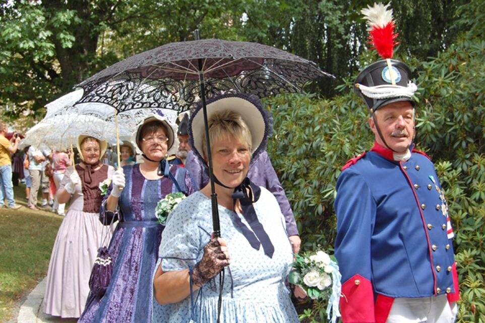 Eine Zeitreise in die Epoche des Biedermeiers wartet: Geschichtsbegeisterte flanieren in historischen Gewändern des 19. Jahrhunderts durch den Kurpark. Der Anblick der aufwändig gestalteten Kostüme verzaubert. In Verbindung mit dem romantischen Flair des Kurparks entfaltet das Flanieren eine ganz besondere Wirkung.