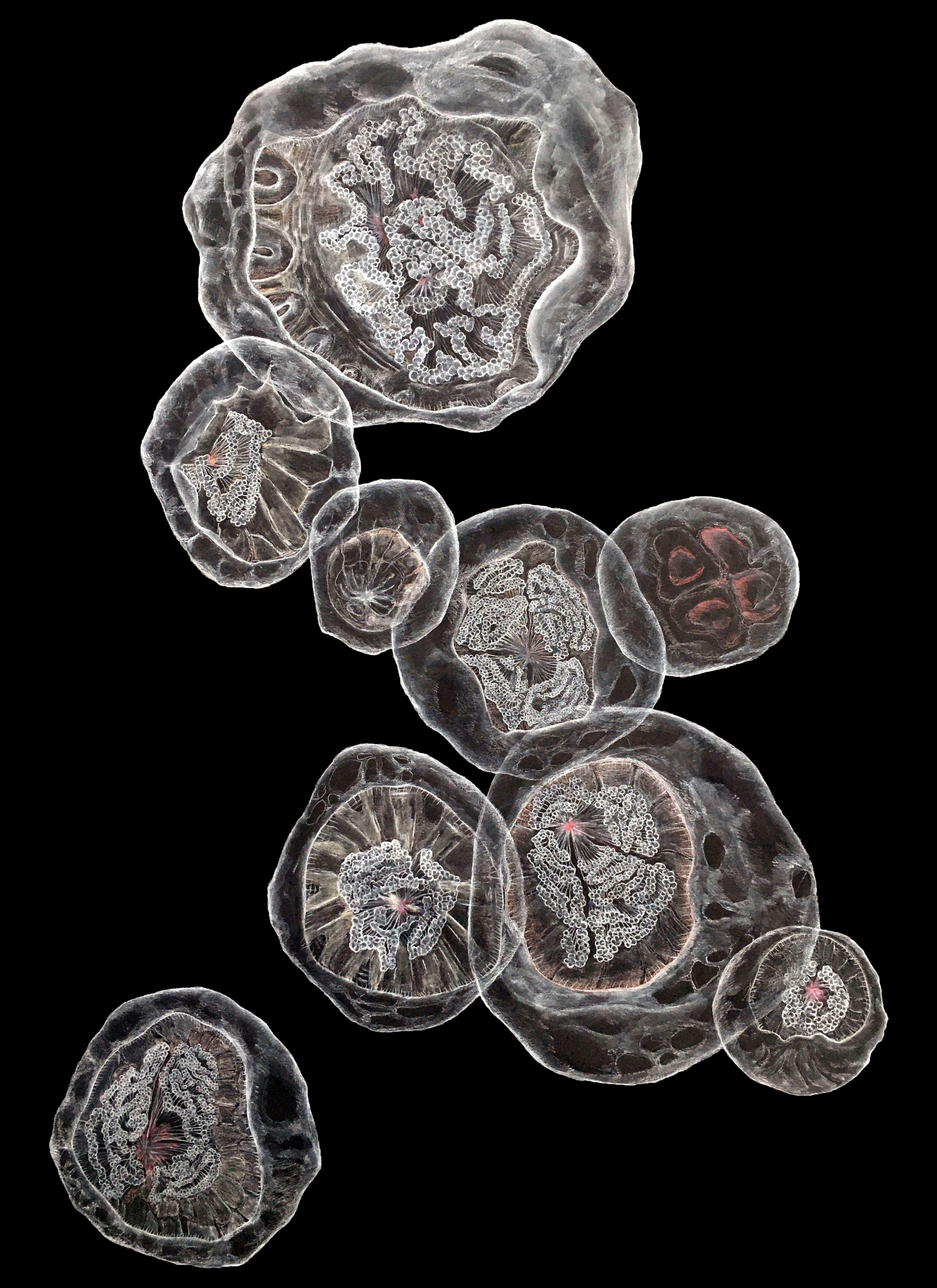 Die aquarellierte Zeichnung, die eine Qualle zeigt, deren durchscheinende Körperhaftigkeit fast eins mit dem Meer zu werden scheint, leuchtet aus der Nische und vermischt sich mit dem diffusen Licht der Kapelle, das durch die Maueröffnungen eindringt.