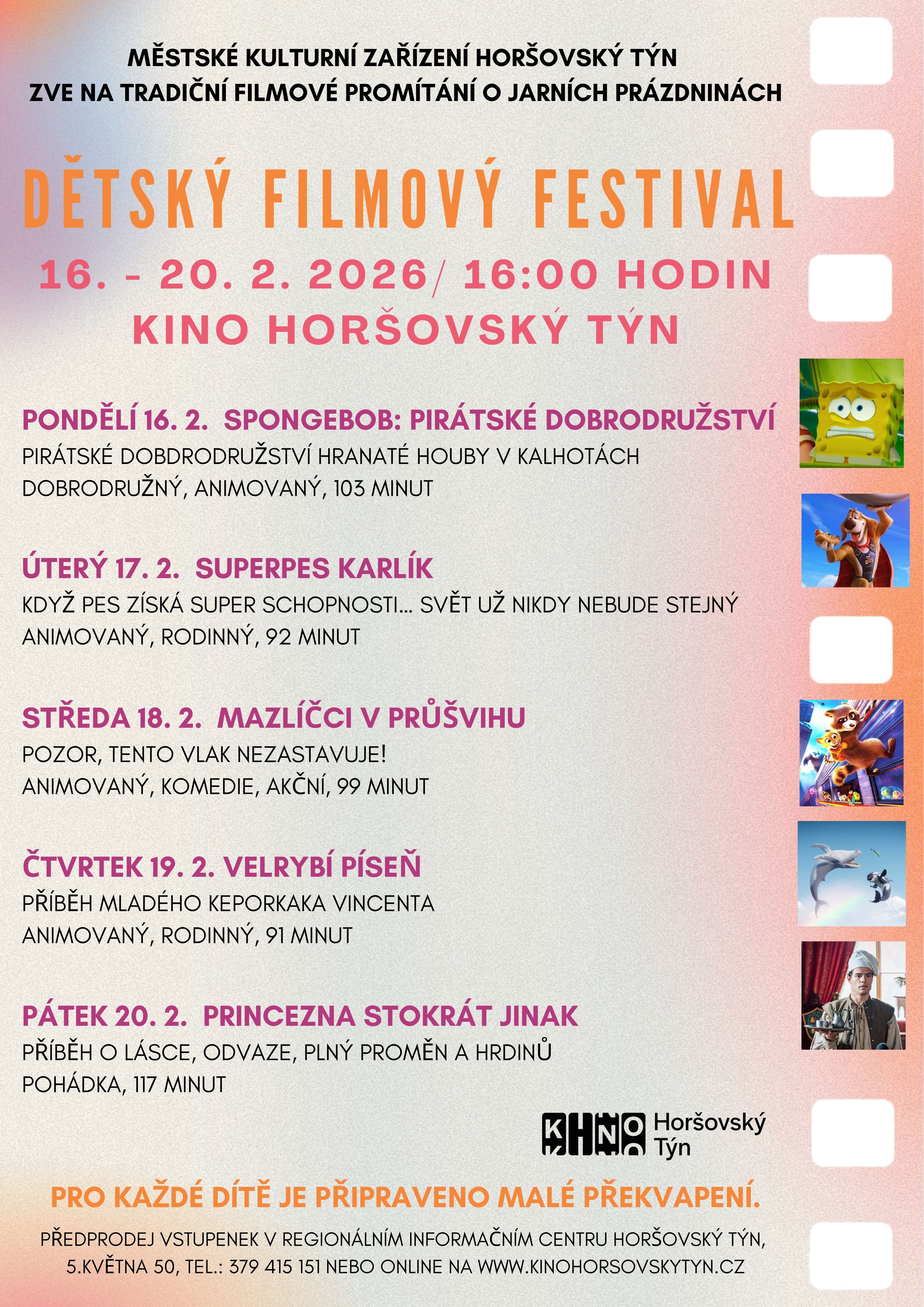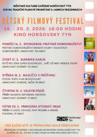 Kinderfilmfestival Traditionelle Filmvorführung in den Frühjahrsferien.Termin 16.02.2026 16:00 - 20.02.2026 16:00 Veranstalter Stadtkulturzentrum Horšovský Týn (Bischofteinitz)