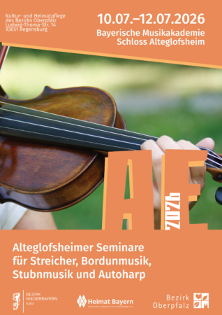 Vom 10. Juli bis 12. Juli 2026 lädt das Referat der Kultur und Heimatpflege des Bezirks Oberpfalz, gemeinsam mit dem Kulturreferat des Bezirks Niederbayern und dem Bayerischen Landesverein für Heimatpflege wieder Musikantinnen und Musikanten in die Bayerische Musikakademie nach Alteglofsheim ein.