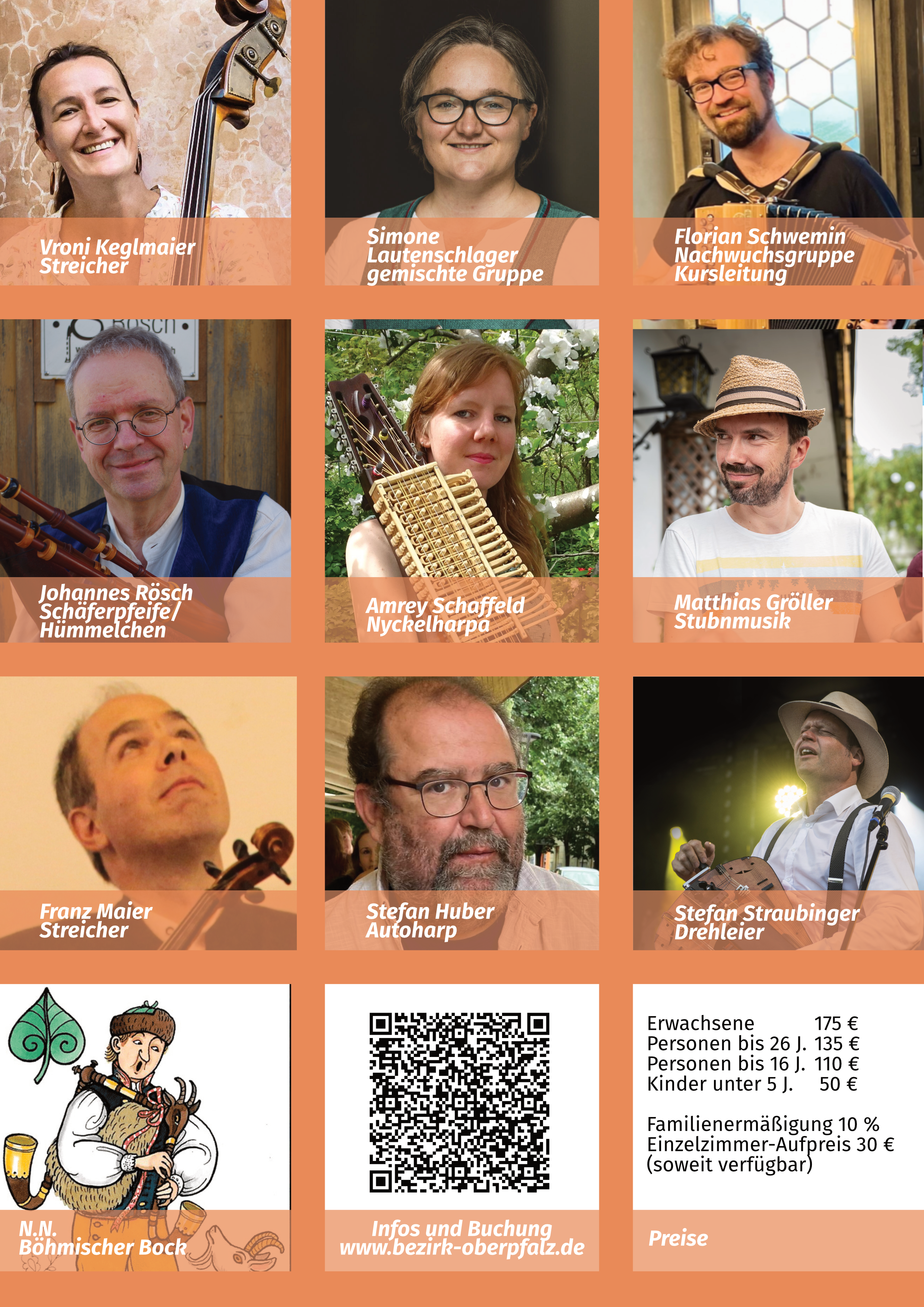 In den Kursen am Freitag und Samstag werden in Gruppen die vielfältigen Aspekte der regionalen Musikkultur mit einem Fokus auf Ostbayern erarbeitet. Ein besonderes Augenmerk liegt auf dem lebendigen und gemeinsamen Musizieren. Am Samstagabend spielen die Teilnehmenden in der Schlossgaststätte „Zur Post“ zum Tanz auf. Sonntags kann man in zwei 45-minütigen Workshops in andere Musikstile, Instrumente oder Lieder hineinschnuppern.