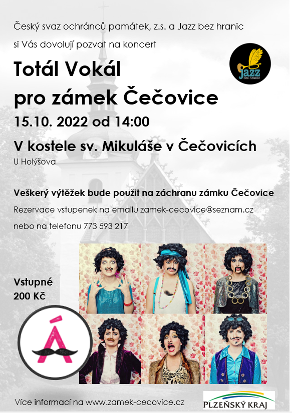 Konzert der fantastischen Vokalgruppe Totál Vokál in der St.-Nikolaus-Kirche in Čečovice. Die Kirche ist ein einzigartiges nationales Kulturdenkmal aus Backstein und im gotischen Stil. Die Besucher sollten sich das Erlebnis des Konzerts und der Kirche nicht entgehen lassen. Nach dem Konzert findet eine Besichtigung des Schlosses Čečovice statt, für dessen Erhalt das Konzert organisiert wird.