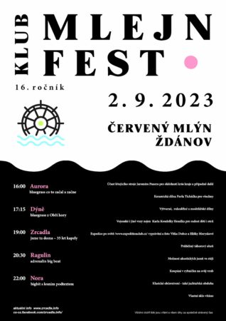 Zum 16. Mal findet das Mühlenfest (tsch. „Mlejnfest“) in der Roten Mühle (Červený mlýn, Žďánov) statt. Wie jedes Jahr ist neben vollem Musikprogramm auch ein buntes Begleitprogramm vorbereitet.